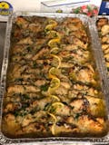 Half tray of pasta in homemade marinara sauce with a choice of meatballs, chicken, eggplant parmigiana, chicken marsala or chicken francese. Comes with fresh homemade salad and garlic knots. Served for 6 people.